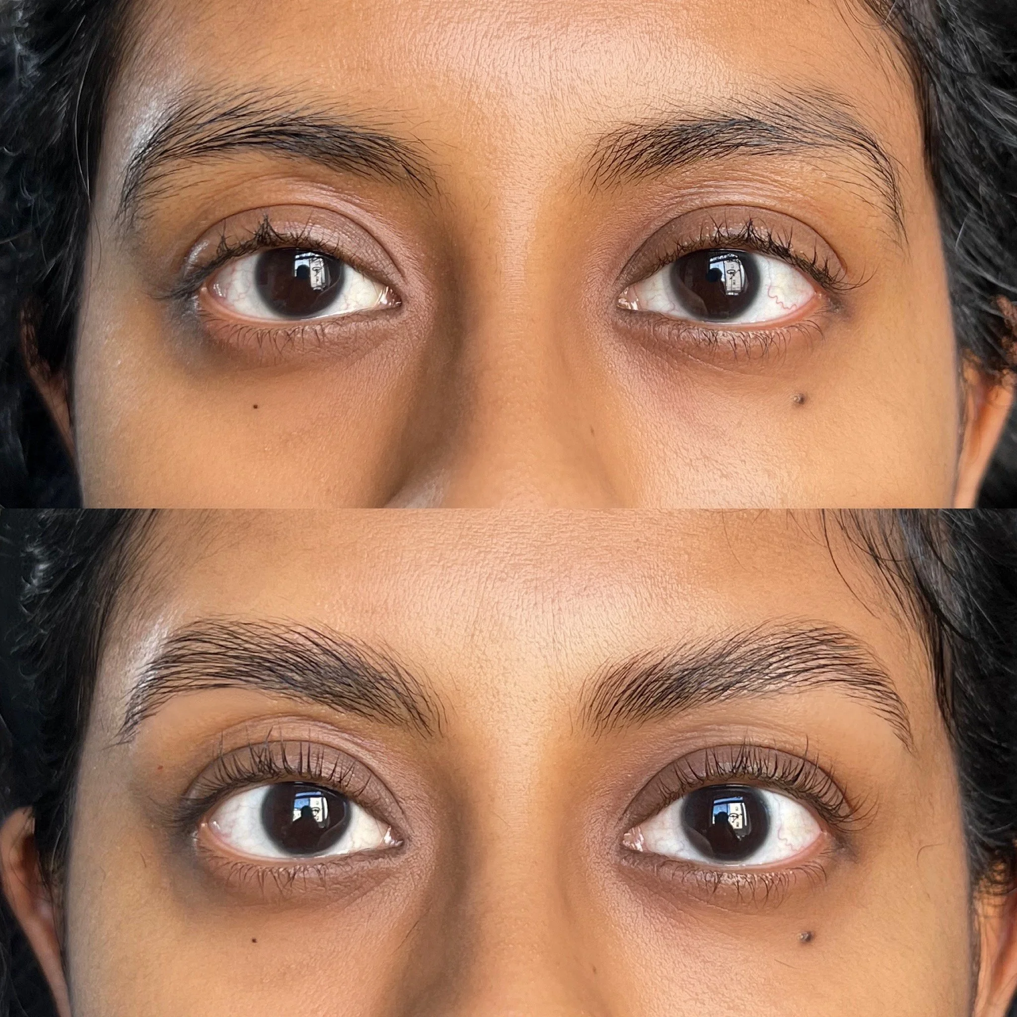 I apply a custom lash tint from root to tip to darken and define. You can choose a classic black tint or a softer purple-black tint, both enhancing length, depth, and contrast.